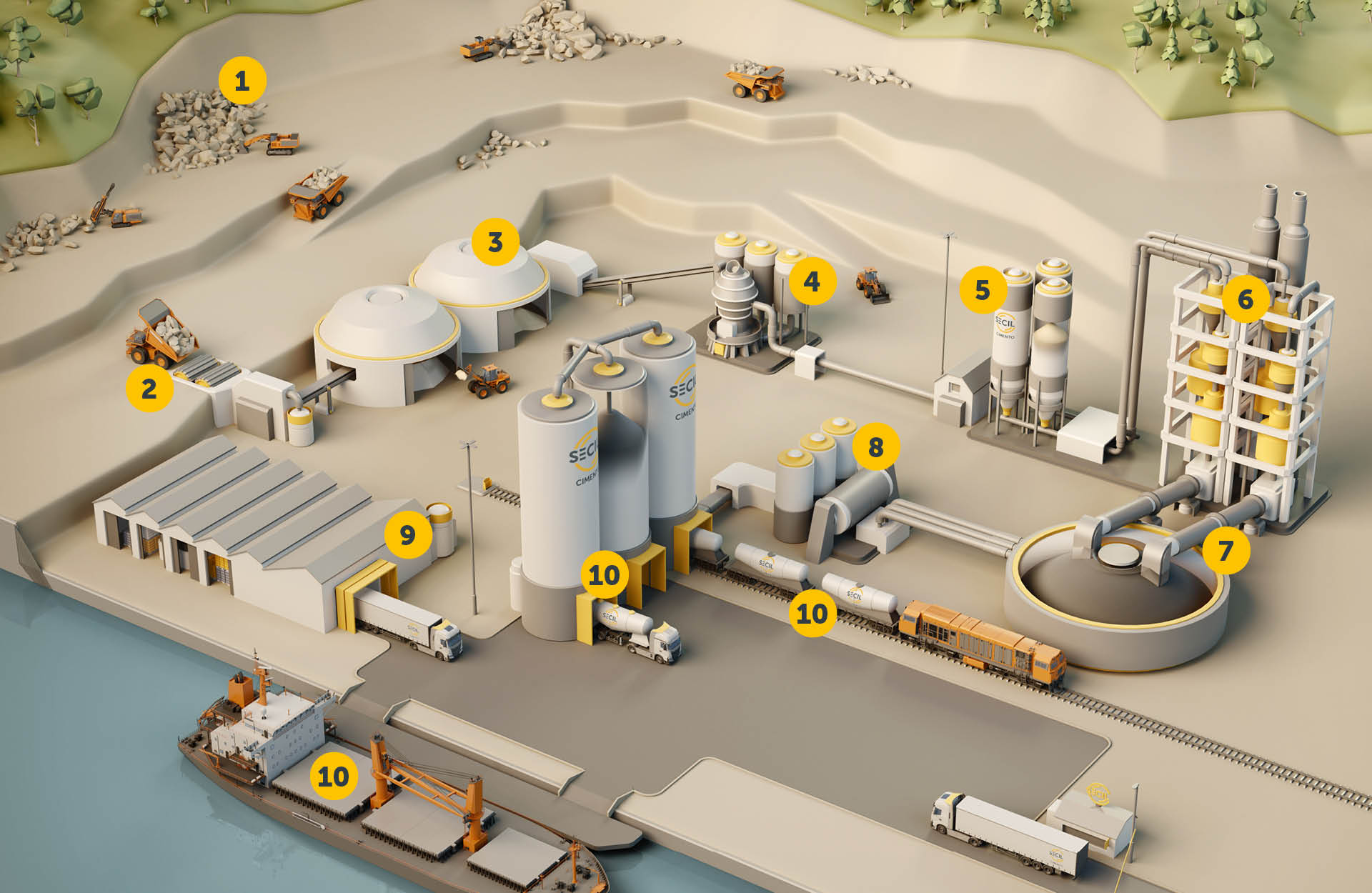 The natural raw materials and correction materials (sand and iron oxide) are then dosed, taking into account the quality of the product to be obtained (clinker), an operation that is controlled via process computers.